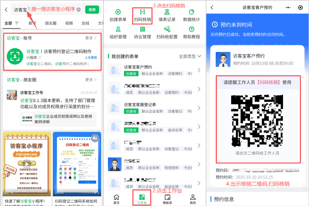 - 进入小程序:管理员打开访客宝小程序,点击“工作台”,选择“扫码核销”。