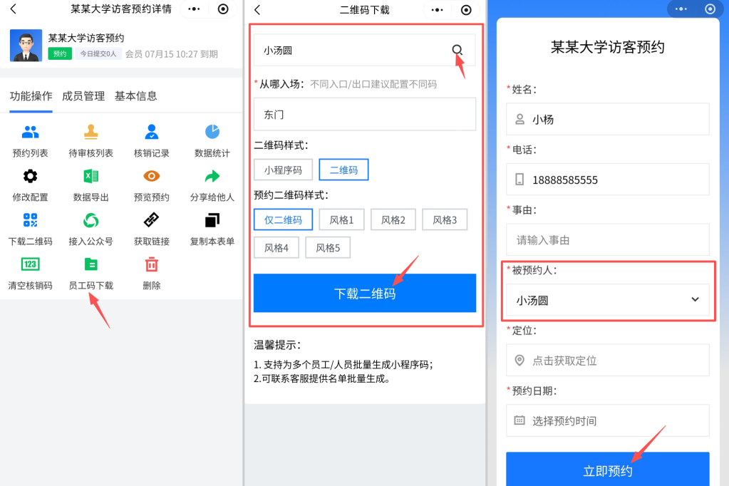 管理员操作:登录访客宝管理后台 → 点击工作台→ 选择您之前创建的表单点击进入表单详情 →点击员工码下载 → 选择需要生成二维码的成员 → 点击"下载员工码"即可获取高清二维码图片。