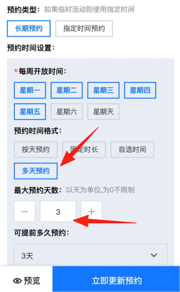 创建和更新预约时在选择预约时间格式时支持设置多天预约,可设置最大预约天数。